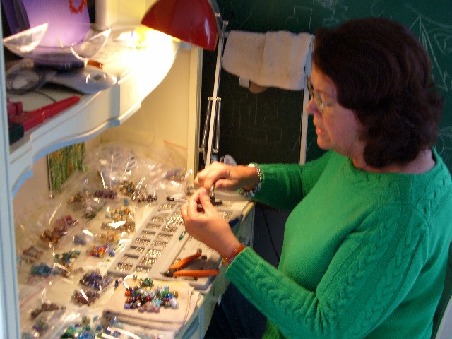 Here I'm choosing sterling silver beads to string up with my beads to make custom bracelets sized to fit the new owner.When I began in 2005 I made and sold many bracelets with my beads, but now I just concentrate on making beads and let jewelry designers create with them. ( I still do some jewelry by special order, contact me for more information.)