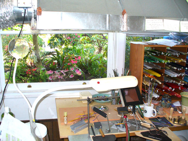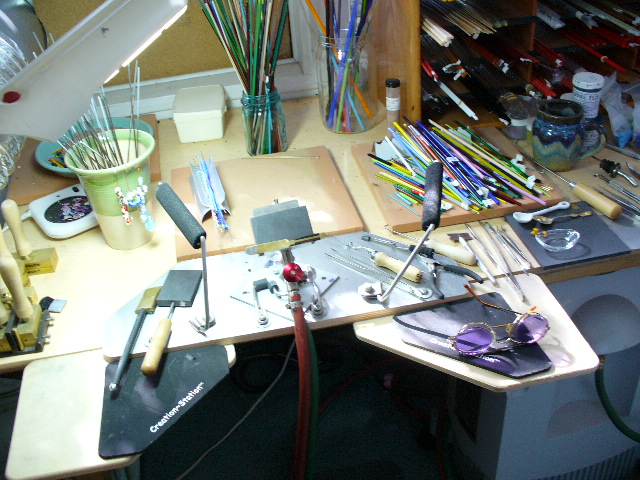 In my workspace I have many tools that help me manipulate the glass. I always wear special glasses with protective lenses that shield my eyes from the torch glare. I use a daylight lamp that helps me to see the colors accurately.